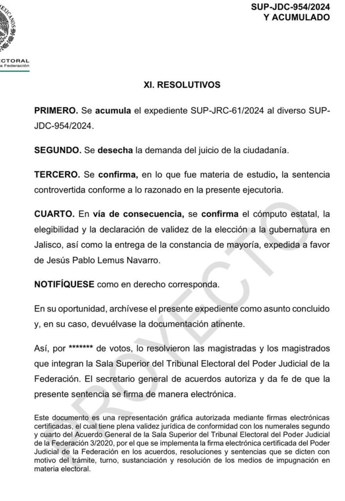 El Magistrado Felipe Fuentes circuló este jueves (10.10.24) su proyecto de resolución de la impugnación del resultado de la elección de Jalisco, en el que ratifica el triunfo de Pablo Lemus Navarro al cargo de Gobernador de Jalisco.