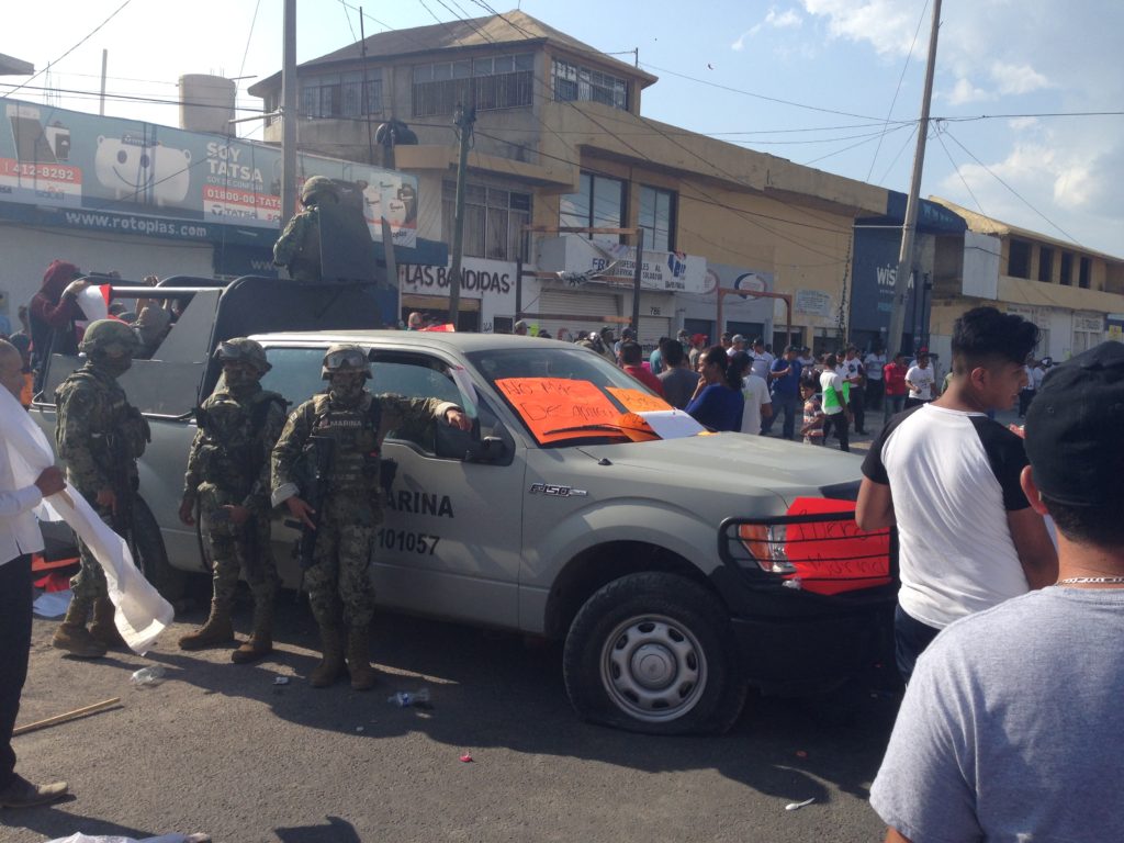 Cerca de las 18:00 horas avanzó una fila de jóvenes más robustos altos, que grafitearon en el carro “Putos rateros” y “CJNG (Cártel Jalisco Nueva Generación)”. Un par se treparon al techo del vehículo y desde ahí golpearon con palos a los marinos. En ese momento llegaron policías municipales, una patrulla estatal y al menos dos de la Marina. Los municipales se acercaron para distraer a los hombres y los marinos salieron por distintos lados, entre golpes, empujones, pedradas y ofensas del tumulto.