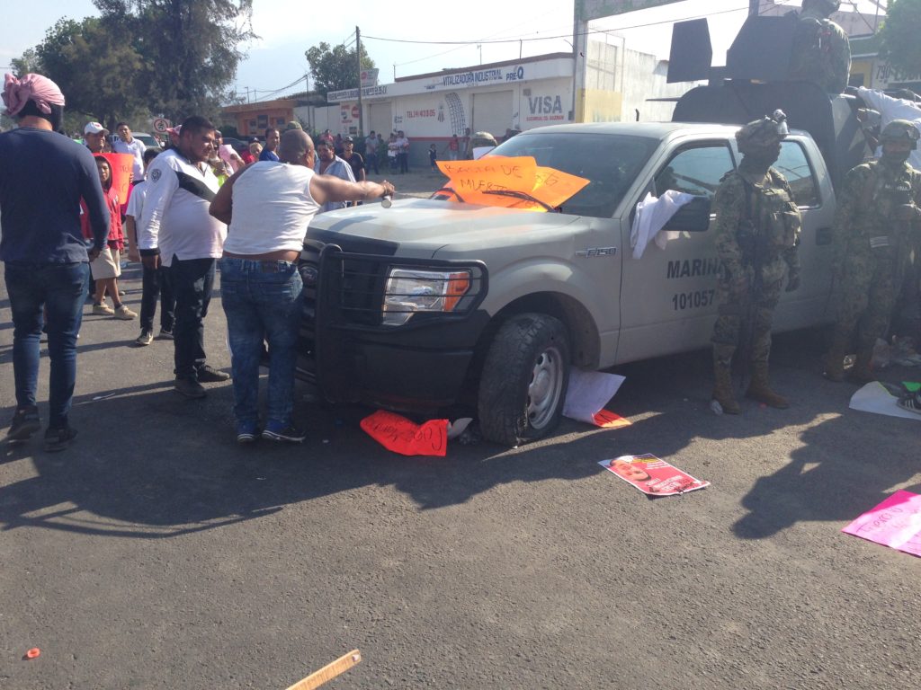 Cerca de las 18:00 horas avanzó una fila de jóvenes más robustos altos, que grafitearon en el carro “Putos rateros” y “CJNG (Cártel Jalisco Nueva Generación)”. Un par se treparon al techo del vehículo y desde ahí golpearon con palos a los marinos. En ese momento llegaron policías municipales, una patrulla estatal y al menos dos de la Marina. Los municipales se acercaron para distraer a los hombres y los marinos salieron por distintos lados, entre golpes, empujones, pedradas y ofensas del tumulto.