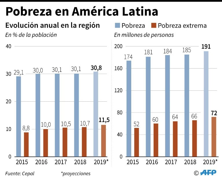 De acuerdo al informe, en 2019 el número de pobres aumentaría a 191 millones, de los cuales 72 millones estarían en la pobreza extrema. La cantidad de pobres es seis millones mayor que la de 185 millones reportada en 2018.